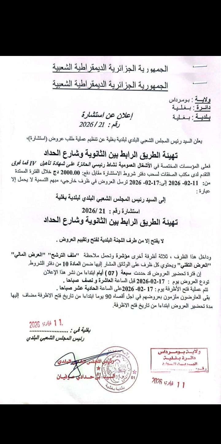 :يعلن السيد رئيس المجلس الشعبي البلدي لبلدية بغلية عن الاستشارة رقم 21 لانجاز المشروع التالي
