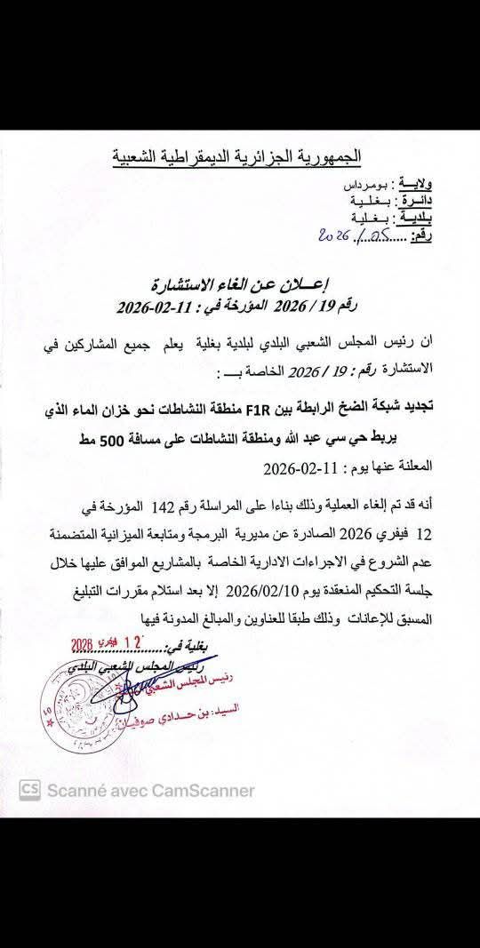 :يعلن السيد رئيس المجلس الشعبي البلدي لبلدية بغلية عن إلغاء الاستشارة رقم 19 لانجاز المشروع التالي