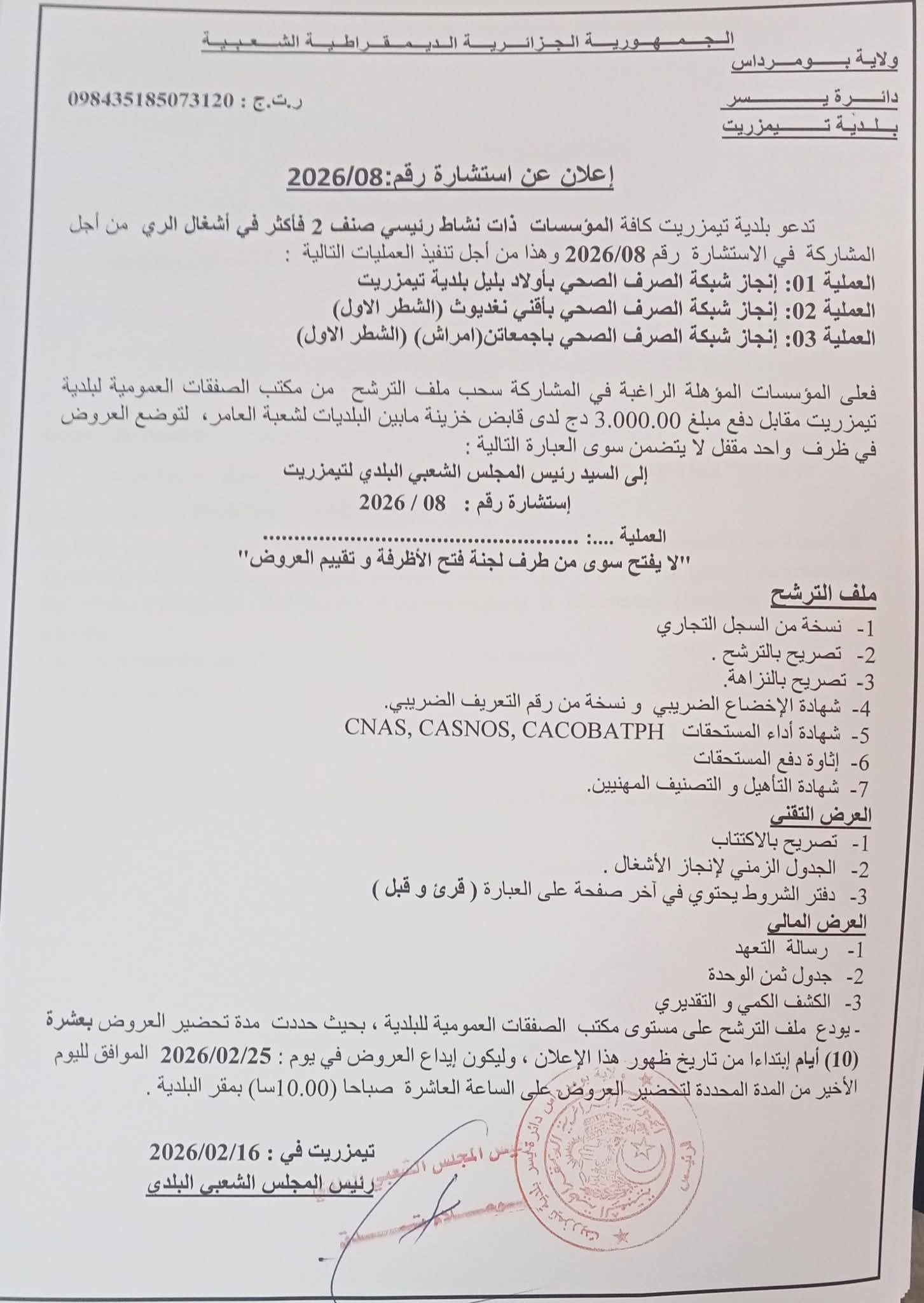 يعلن السيد رئيس المجلس الشعبي البلدي لبلدية تيمزريت عن الاستشارة رقم 08 لانجاز المشروع التالي