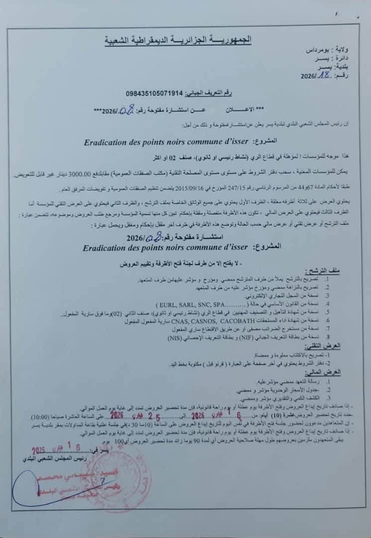 يعلن السيد رئيس المجلس الشعبي البلدي لبلدية يسر عن الاستشارة رقم 08 لانجاز المشروع التالي