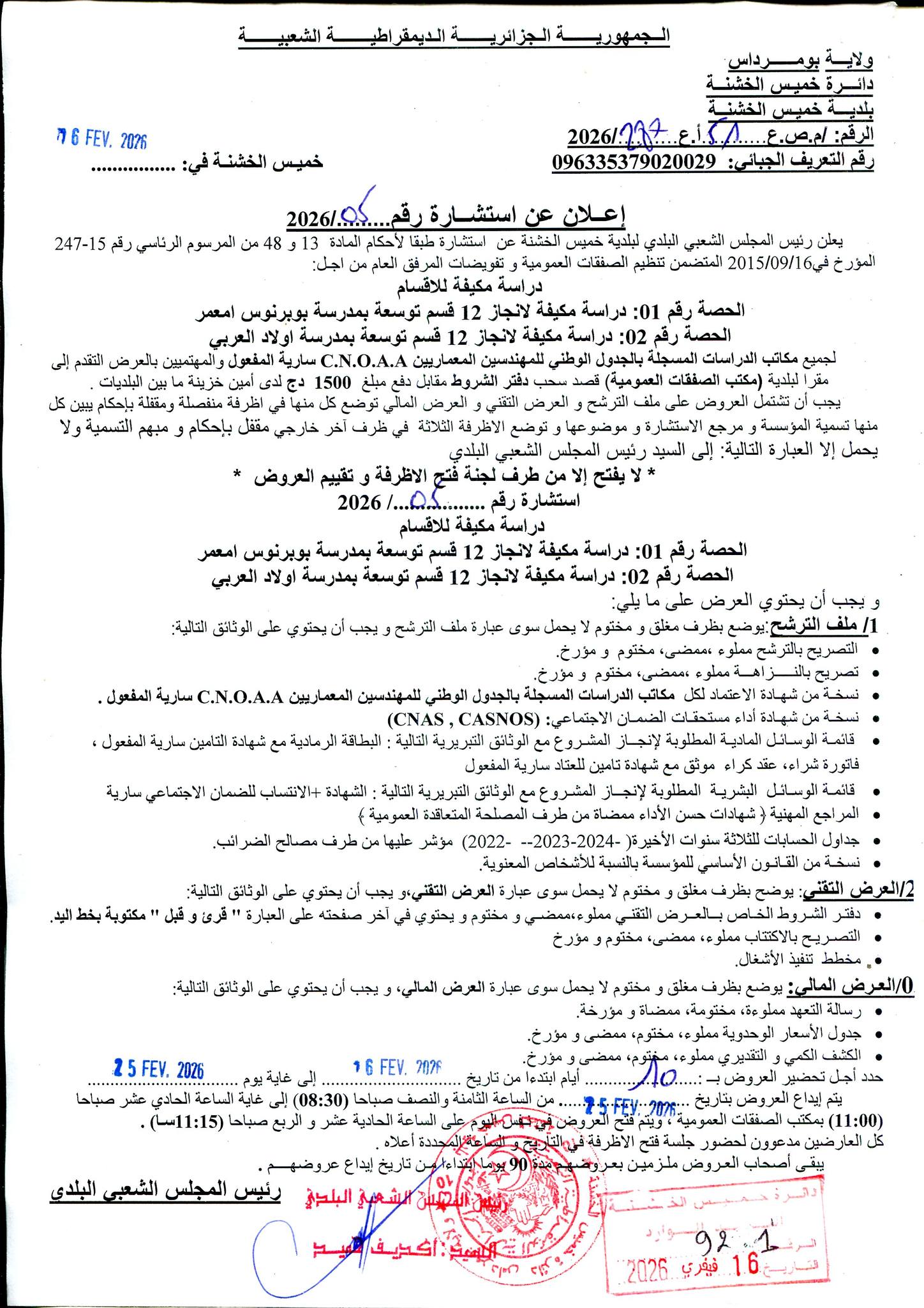 يعلن السيد رئيس المجلس الشعبي البلدي لبلدية خميس الخشنة عن الاستشارة رقم 05 لانجاز المشروع التالي