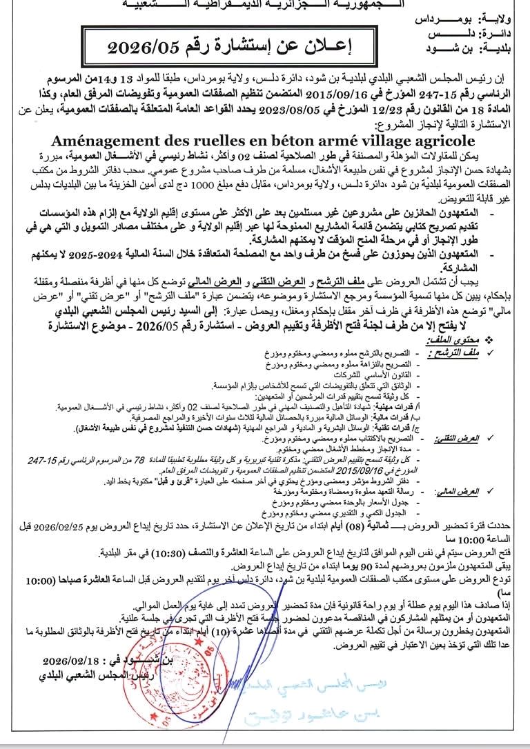 يعلن السيد رئيس المجلس الشعبي البلدي لبلدية بن شود عن الاستشارة رقم 05 لانجاز المشروع التالي
