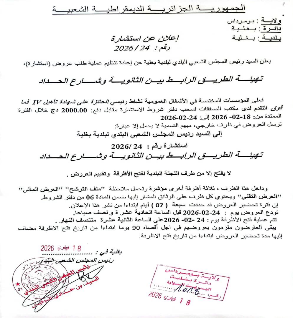 يعلن السيد رئيس المجلس الشعبي البلدي لبلدية بغلية عن الاستشارة رقم 24 لانجاز المشروع التالي