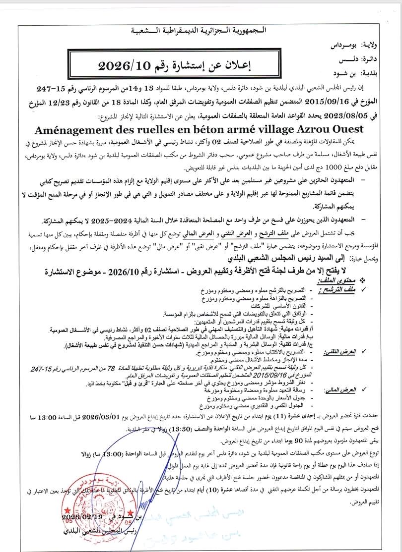 يعلن السيد رئيس المجلس الشعبي البلدي لبلدية بن شود عن الاستشارة رقم 10 لانجاز المشروع التالي