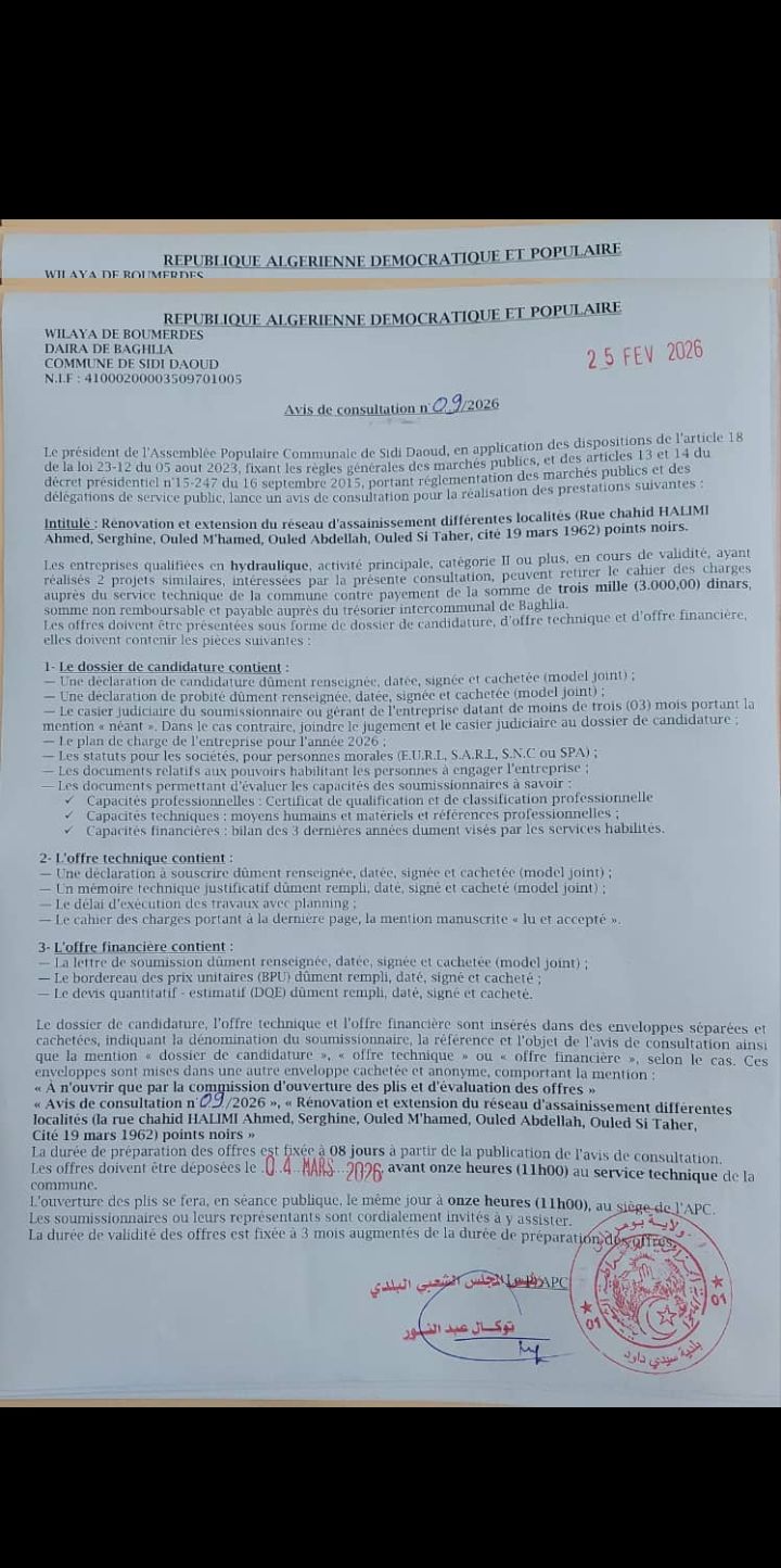 يعلن السيد رئيس المجلس الشعبي البلدي لبلدية سيدي داود عن استشارة رقم 09 لانجاز المشروع التالي