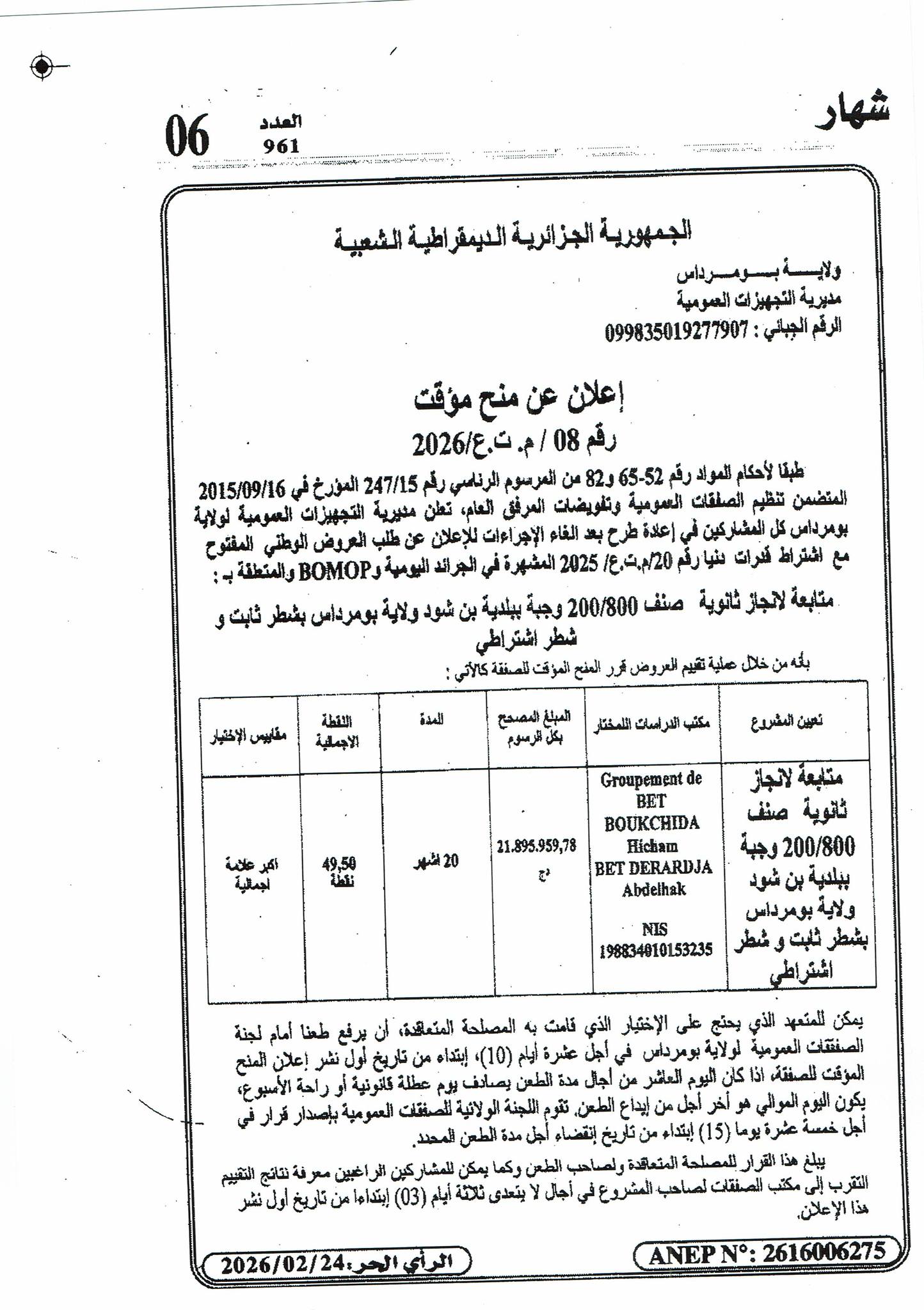 يعلن السيد رئيس المجلس الشعبي البلدي لبلدية دلس عن منح مؤقت رقم 08 لانجاز المشروع التالي