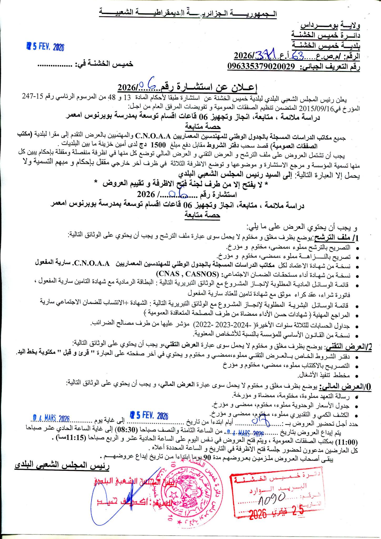 يعلن السيد رئيس المجلس الشعبي البلدي لبلدية دلس عن استشارة رقم 06 لانجاز المشروع التالي