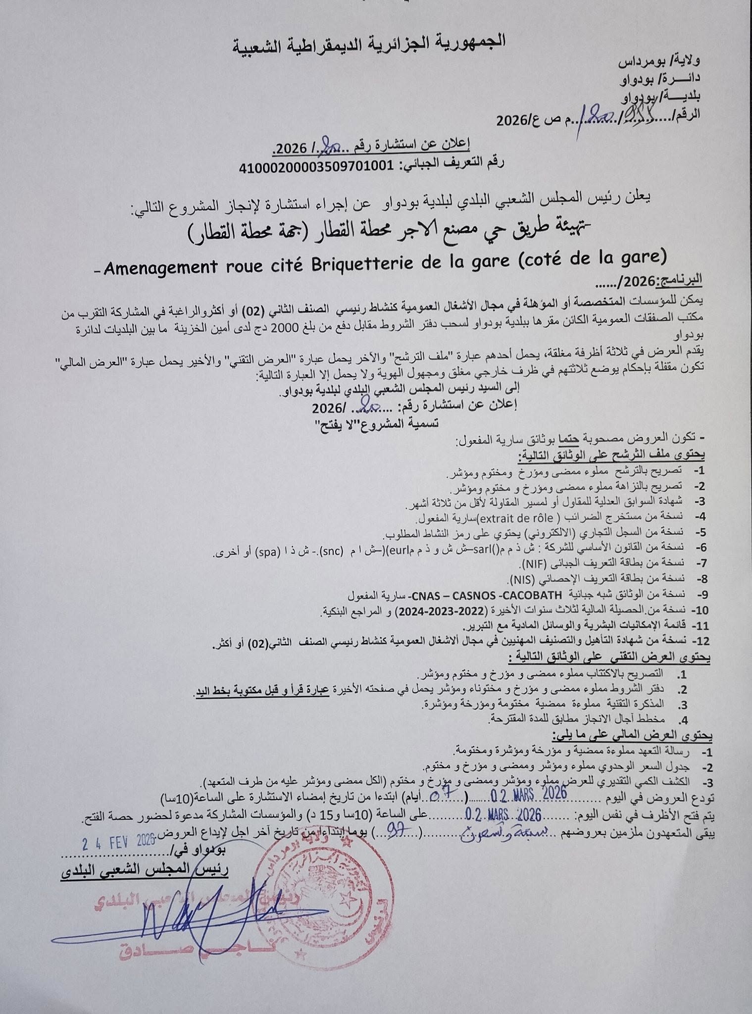 يعلن السيد رئيس المجلس الشعبي البلدي لبلدية بودواو عن استشارة رقم 20 لانجاز المشروع التالي