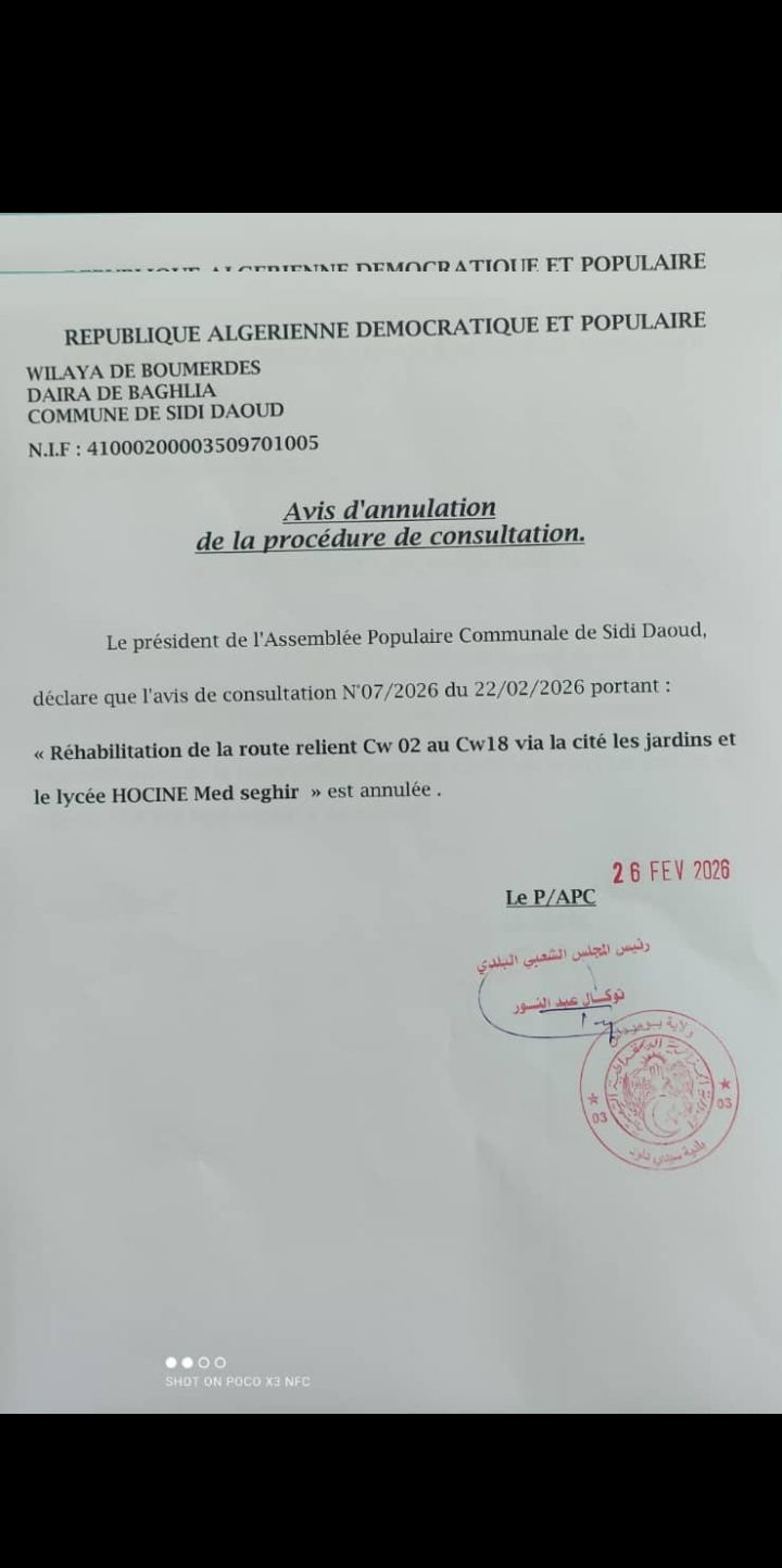 يعلن السيد رئيس المجلس الشعبي البلدي لبلدية سيدي داود عن الغاء استشارة رقم 07 لانجاز المشروع التالي