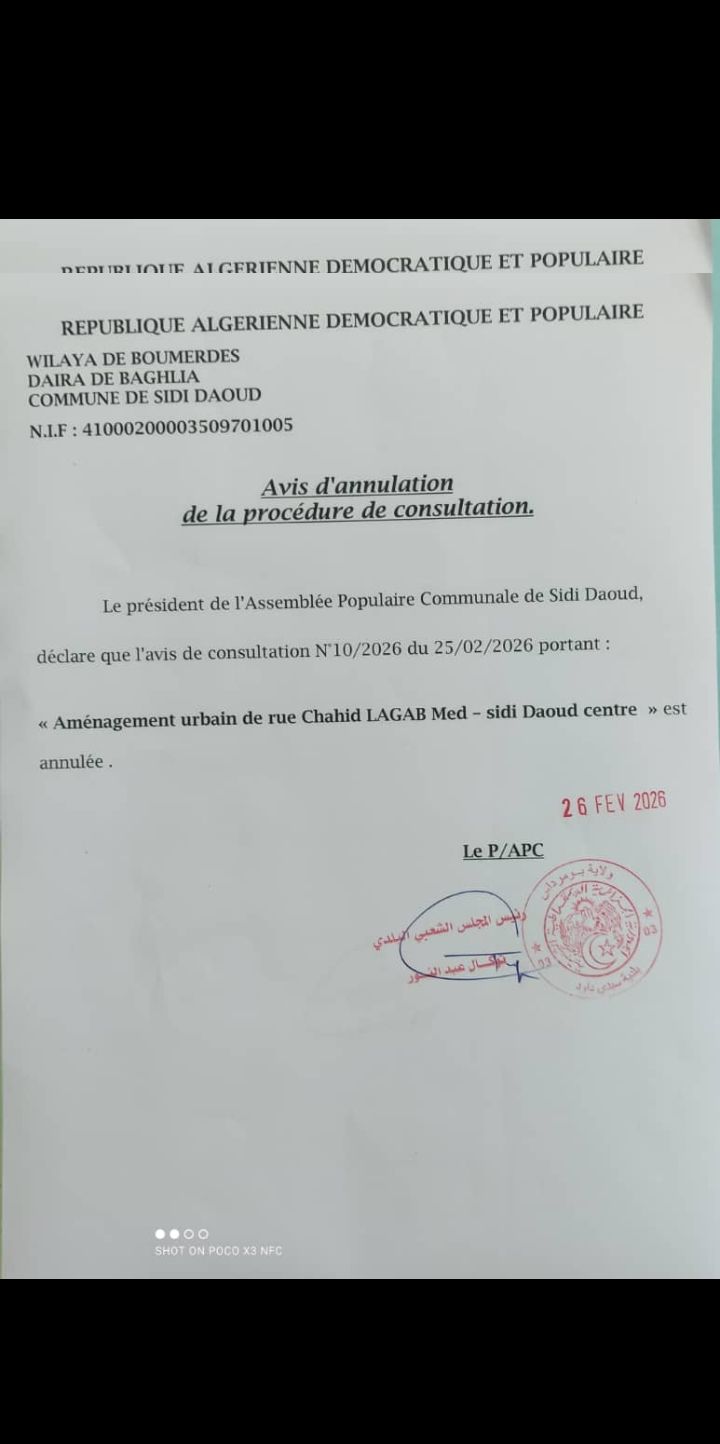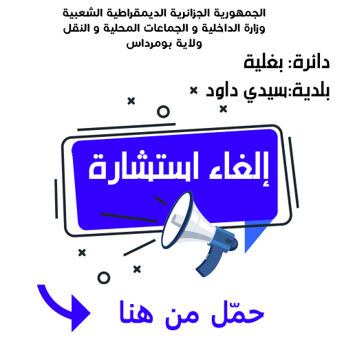 يعلن السيد رئيس المجلس الشعبي البلدي لبلدية سيدي داود عن الغاء استشارة رقم 10 لانجاز المشروع التالي