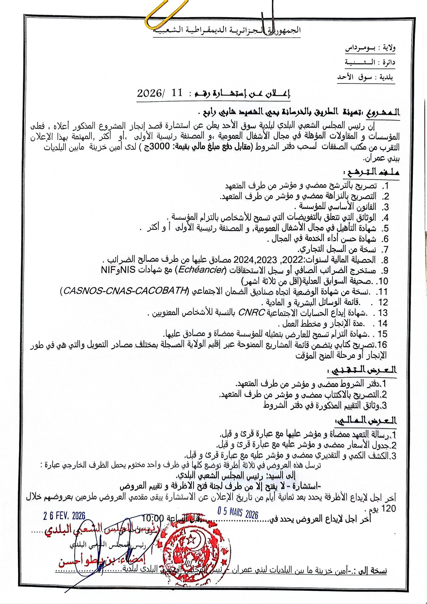 يعلن السيد رئيس المجلس الشعبي البلدي لبلدية سوق الحد عن استشارة رقم 11 لانجاز المشروع التالي