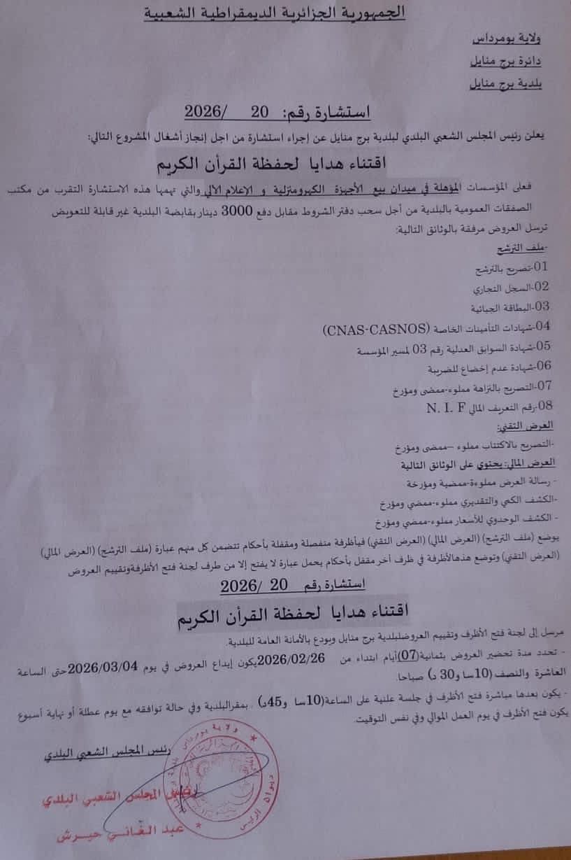 يعلن السيد رئيس المجلس الشعبي البلدي لبلدية برج منايل عن استشارة رقم 20 لانجاز المشروع التالي