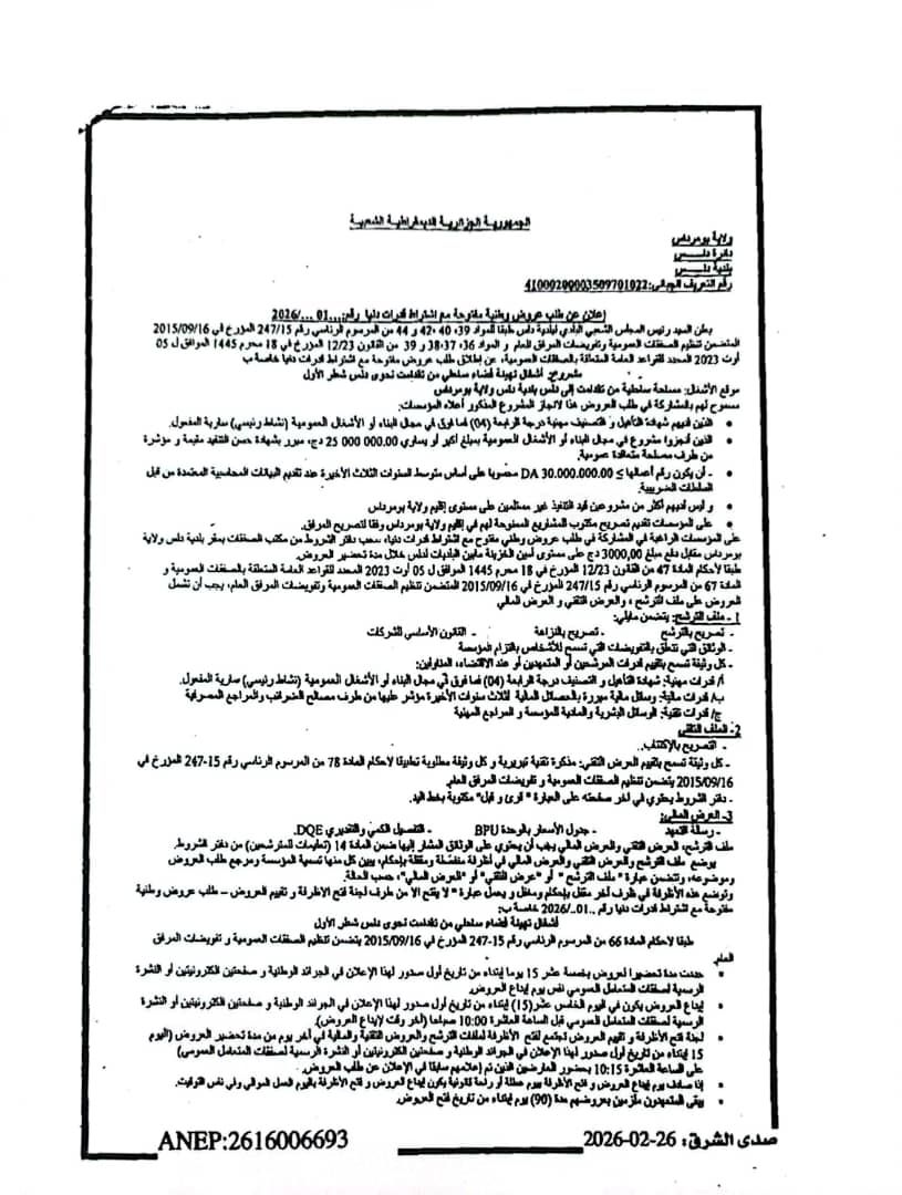 يعلن السيد رئيس المجلس الشعبي البلدي لبلدية دلس عن اعلان عن طلب عروض وطنية مفتوحة مع اشتراط قدرات دنيا رقم 01 لانجاز المشروع التالي
