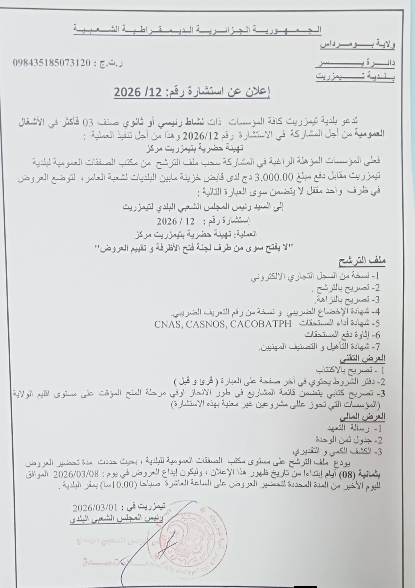 يعلن السيد رئيس المجلس الشعبي البلدي لبلدية تيمزريت عن استشارة رقم 12 لانجاز المشروع التالي