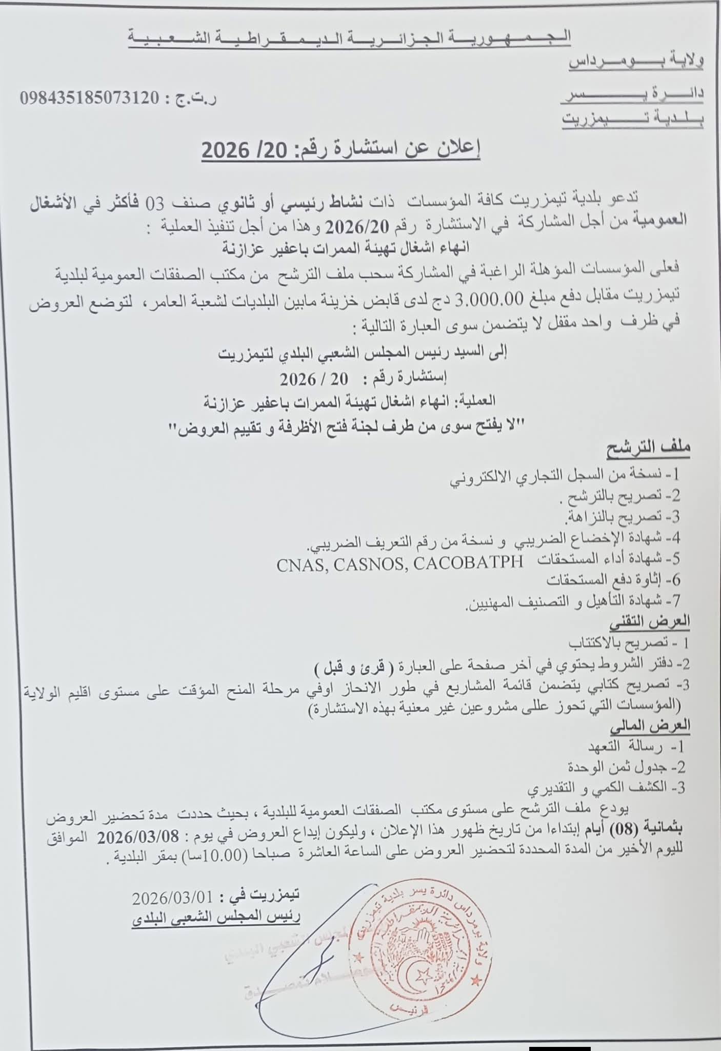 يعلن السيد رئيس المجلس الشعبي البلدي لبلدية تيمزريت عن استشارة رقم 20 لانجاز المشروع التالي
