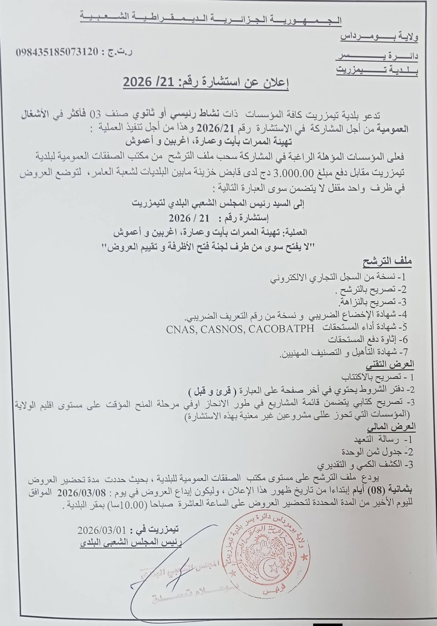 يعلن السيد رئيس المجلس الشعبي البلدي لبلدية تيمزريت عن استشارة رقم 21 لانجاز المشروع التالي