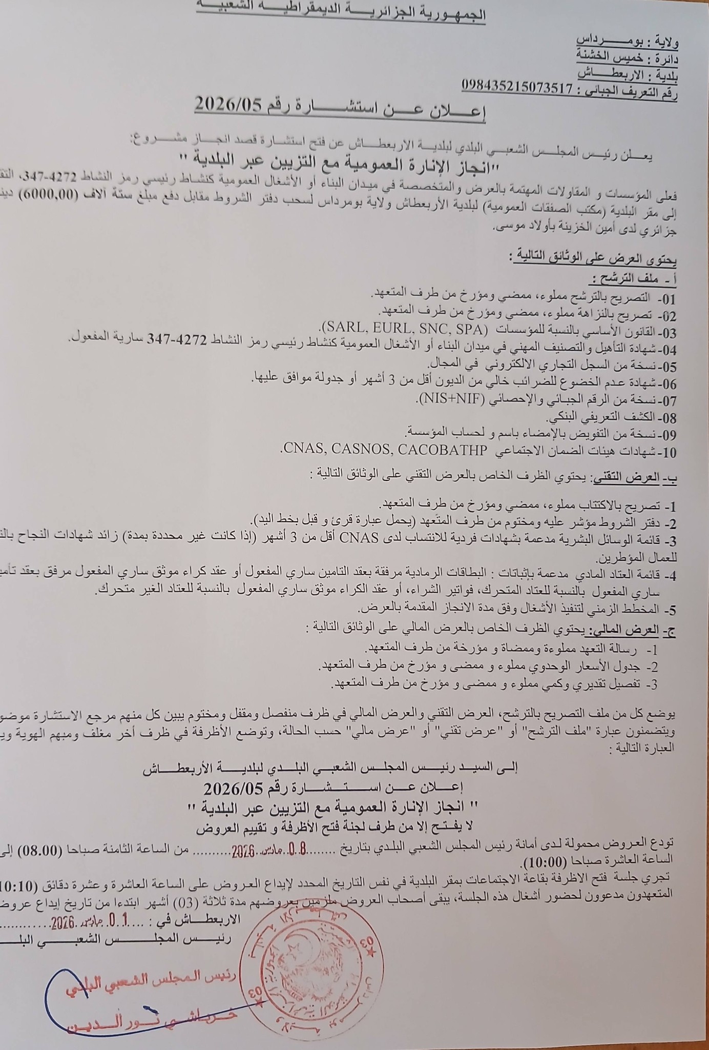 يعلن السيد رئيس المجلس الشعبي البلدي لبلدية الأربعطاش عن استشارة رقم 05 لانجاز المشروع التالي
