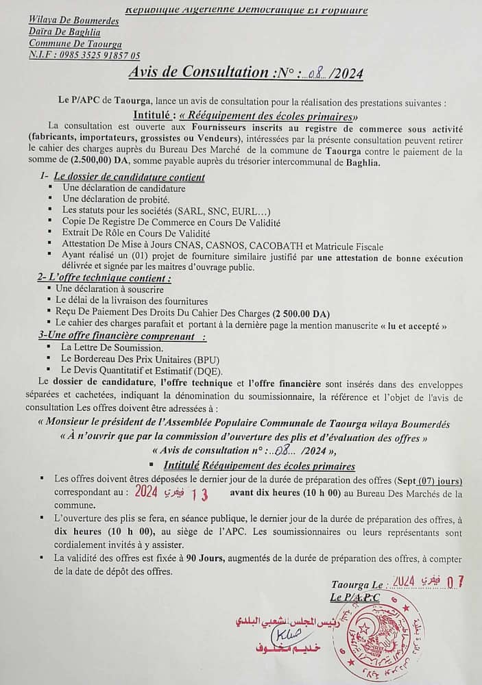 يعلن رئيس المجلس الشعبي البلدي لبلدية تاورقة عن إجراء استشارة لإعادة تجهيز المدارس الإبتدائية