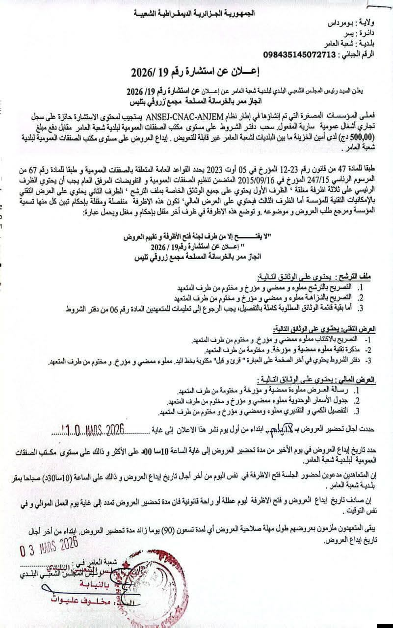 يعلن السيد رئيس المجلس الشعبي البلدي لبلدية شعبة العامر عن استشارة رقم 19 لانجاز المشروع التالي