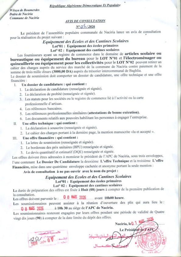 يعلن السيد رئيس المجلس الشعبي البلدي لبلدية الناصرية عن استشارة رقم 05 لانجاز المشروع التالي