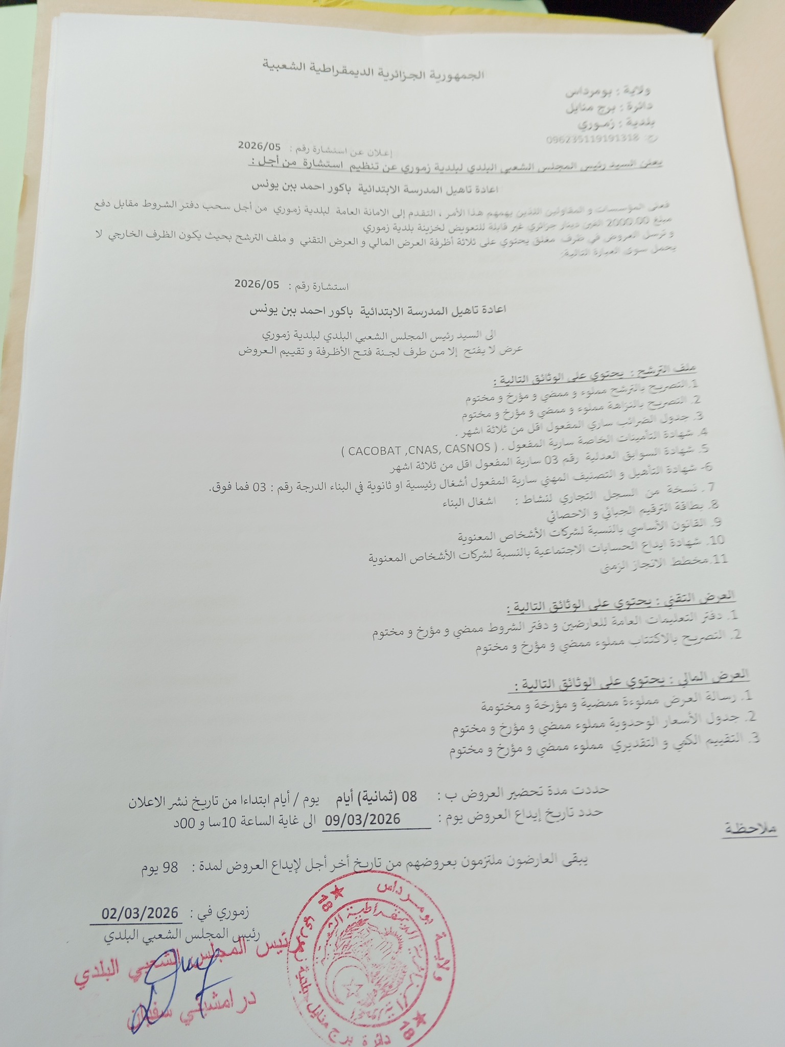 يعلن السيد رئيس المجلس الشعبي البلدي لبلدية زموري عن استشارة رقم 05 لانجاز المشروع التالي