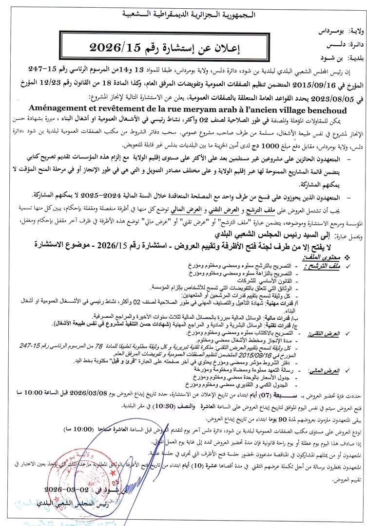 يعلن السيد رئيس المجلس الشعبي البلدي لبلدية بن شود عن استشارة رقم 15 لانجاز المشروع التالي
