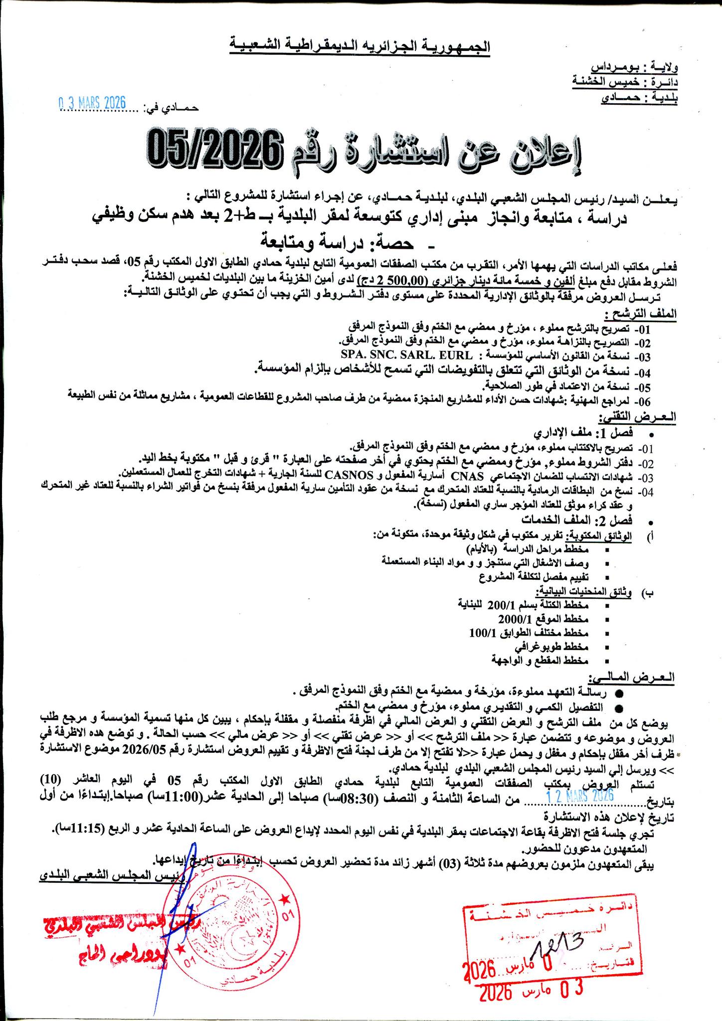 يعلن السيد رئيس المجلس الشعبي البلدي لبلدية حمادي عن استشارة رقم 05 لانجاز المشروع التالي