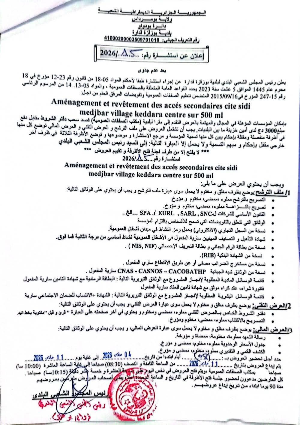 يعلن السيد رئيس المجلس الشعبي البلدي لبلدية بوزقزة قدارة عن استشارة رقم 15 لانجاز المشروع التالي