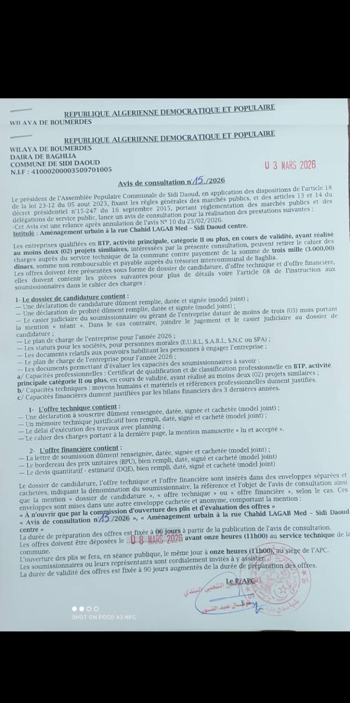 يعلن السيد رئيس المجلس الشعبي البلدي لبلدية سيدي داود عن استشارة رقم 15 لانجاز المشروع التالي