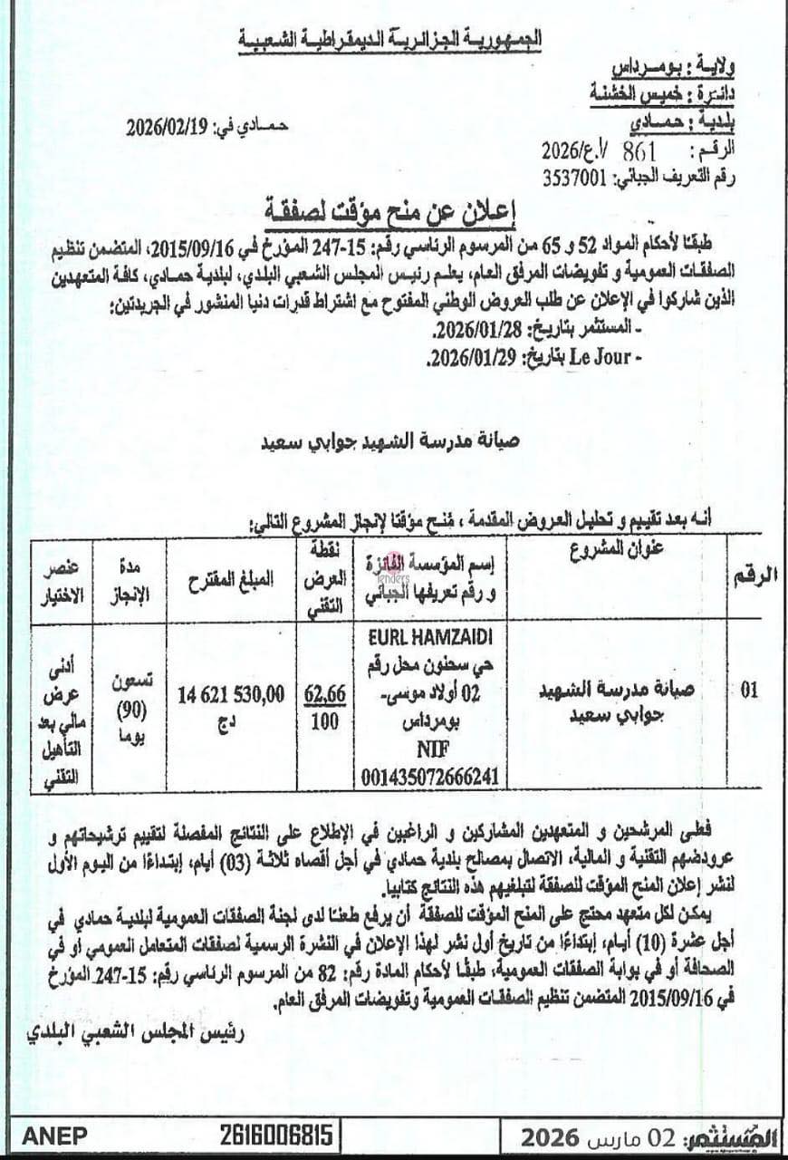 يعلن السيد رئيس المجلس الشعبي البلدي لبلدية حمادي عن منح مؤقت لانجاز المشروع التالي