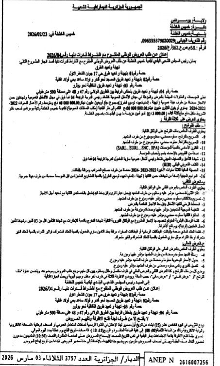 يعلن السيد رئيس المجلس الشعبي البلدي لبلدية خميس الخشنة عن طلب عروض وطني مفتوح مع اشتراط قدرات دنيا لانجاز المشروع التالي