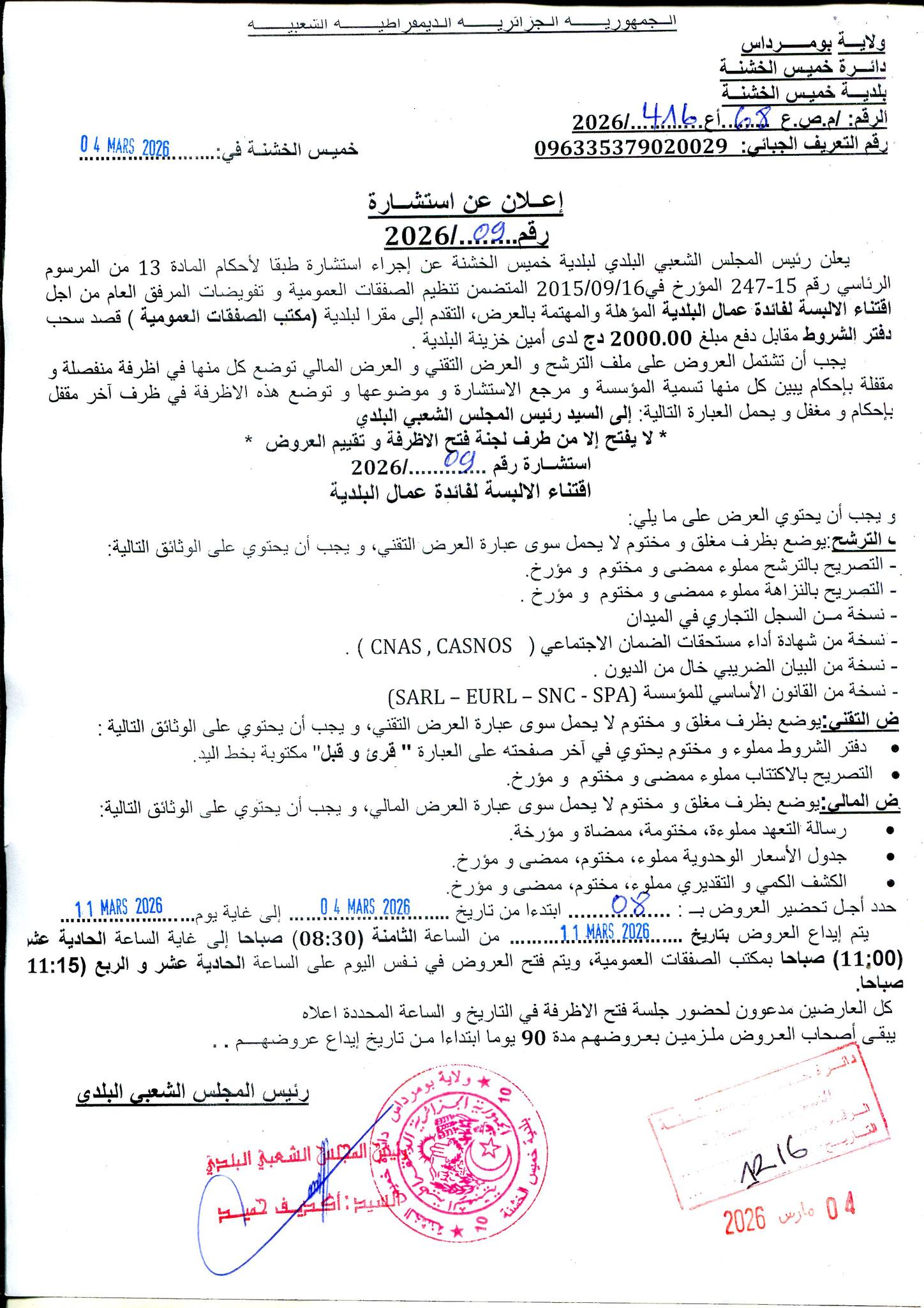 يعلن السيد رئيس المجلس الشعبي البلدي لبلدية خميس الخشنة عن استشارة رقم 09 لانجاز المشروع التالي