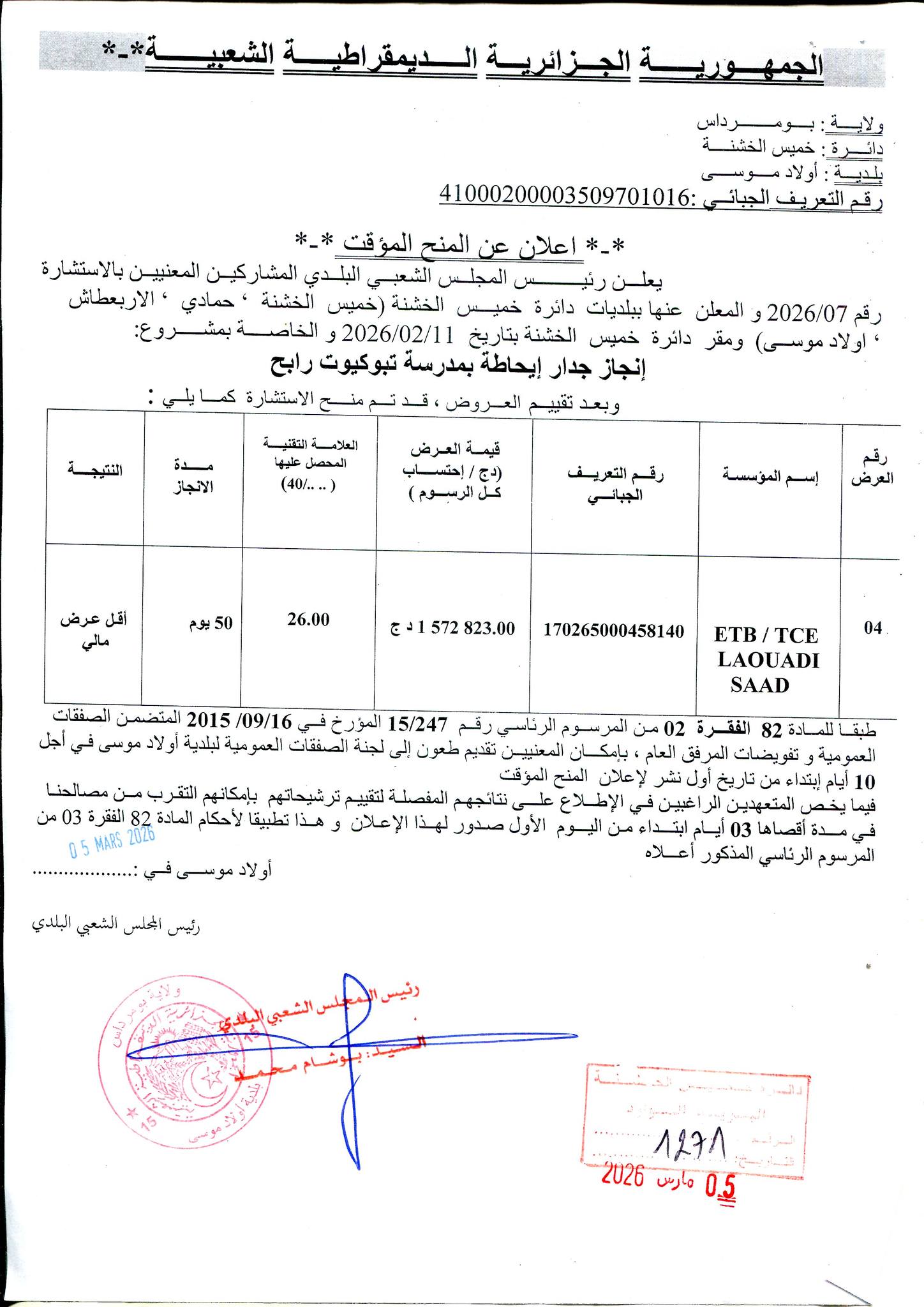 يعلن السيد رئيس المجلس الشعبي البلدي لبلدية أولاد موسى عن منح مؤقت لإنجاز جدار ايحاطة بمدرسة تبوكيوت رابح