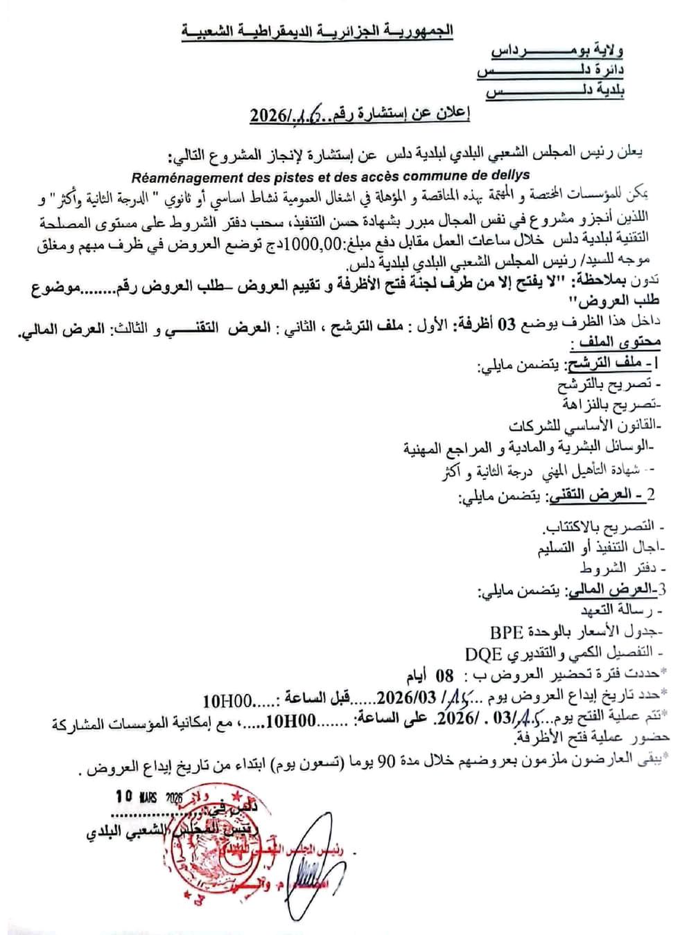 يعلن السيد رئيس المجلس الشعبي البلدي لبلدية دلس عن استشارة رقم 16 لانجاز المشروع التالي