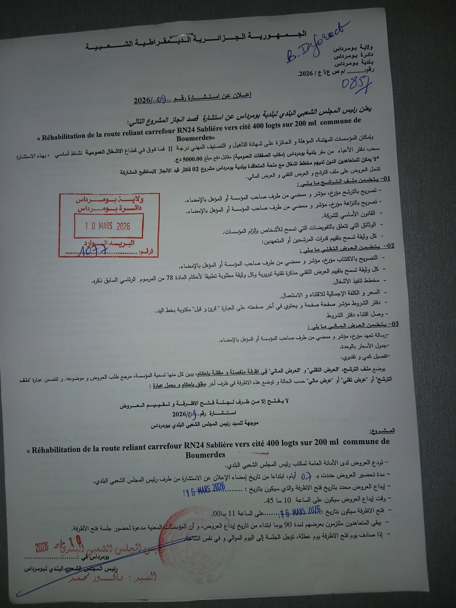يعلن السيد رئيس المجلس الشعبي البلدي لبلدية بومرداس عن استشارة رقم 09 لانجاز المشروع التالي
