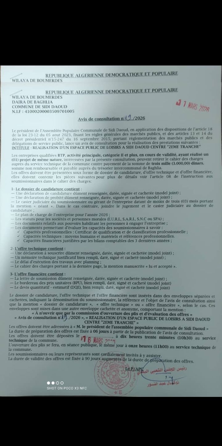 يعلن السيد رئيس المجلس الشعبي البلدي لبلدية سيدي داود عن استشارة رقم 19 لانجاز المشروع التالي