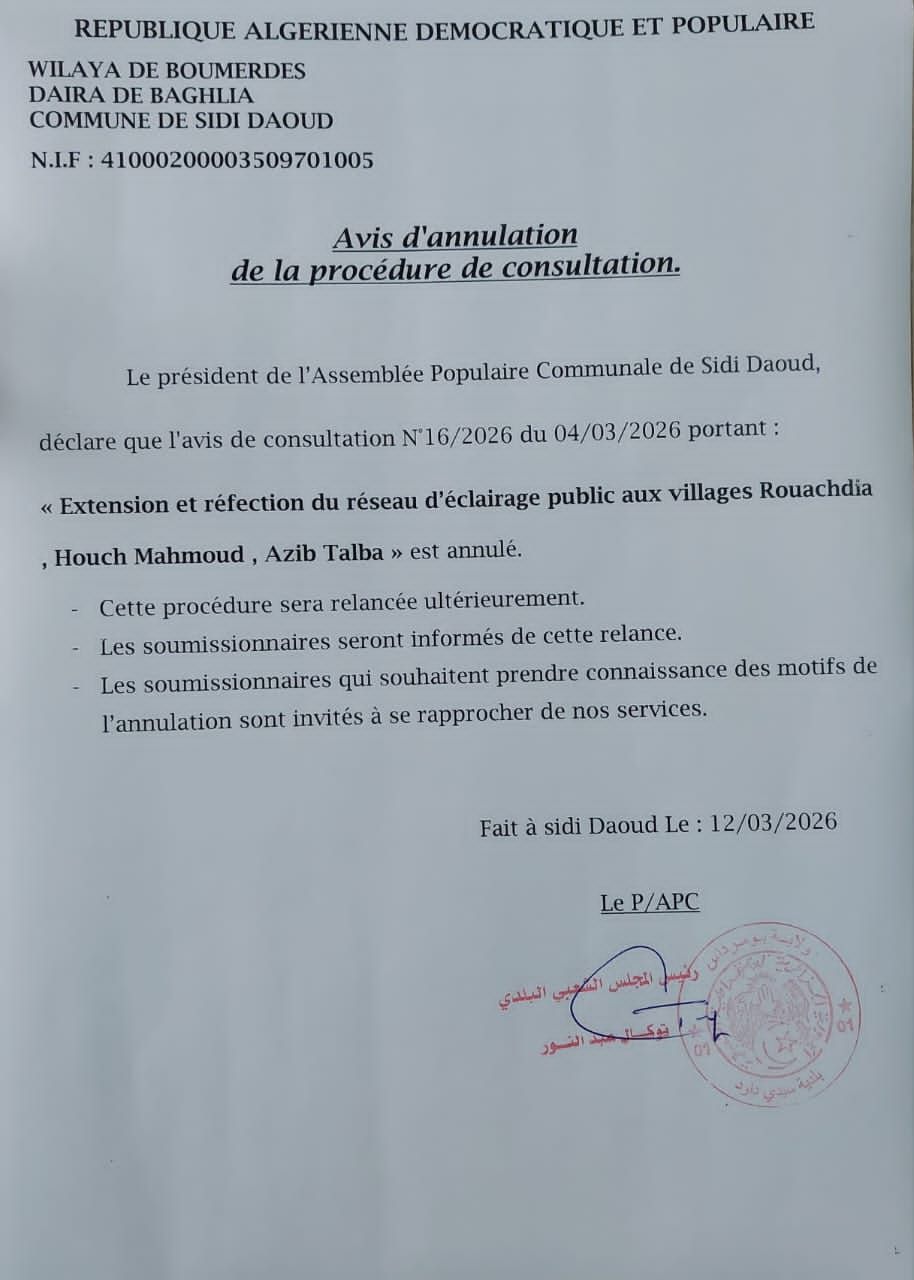 يعلن السيد رئيس المجلس الشعبي البلدي لبلدية سيدي داود عن الغاء استشارة رقم 16 لانجاز المشروع التالي