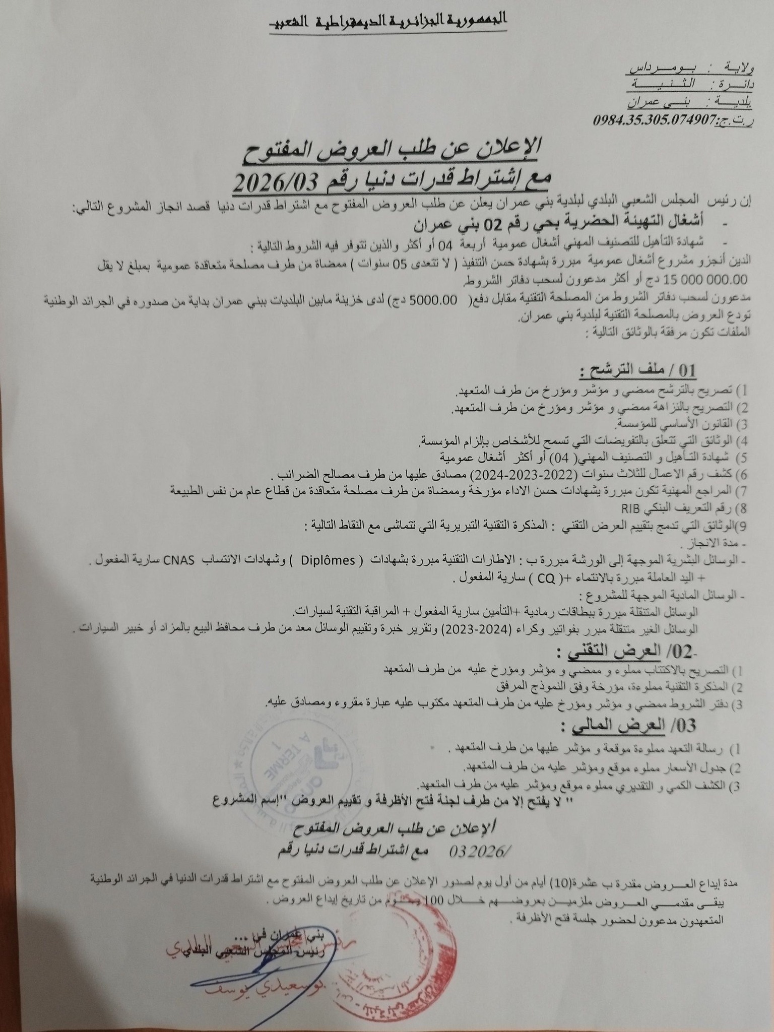إعلان عن طلب عروض وطني مفتوح مع اشتراط قدرات دنيا رقم 03 لبلدية بني عمران