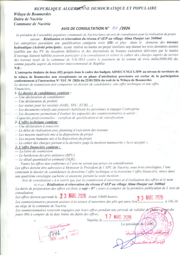 يعلن السيد رئيس المجلس الشعبي البلدي لبلدية الناصرية عن استشارة رقم 10 لانجاز المشروع التالي