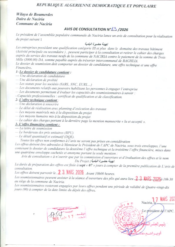 يعلن السيد رئيس المجلس الشعبي البلدي لبلدية الناصرية عن استشارة رقم 13 لانجاز المشروع التالي