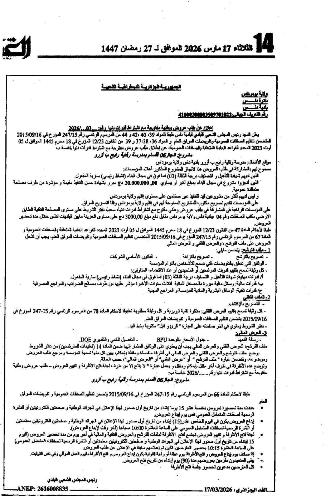 يعلن رئيس المجلس الشعبي البلدي لدلس عن طلب عروض وطنية مفتوحة مع اشتراط قدرات دنيا الخاصة بمشروع رقم 03