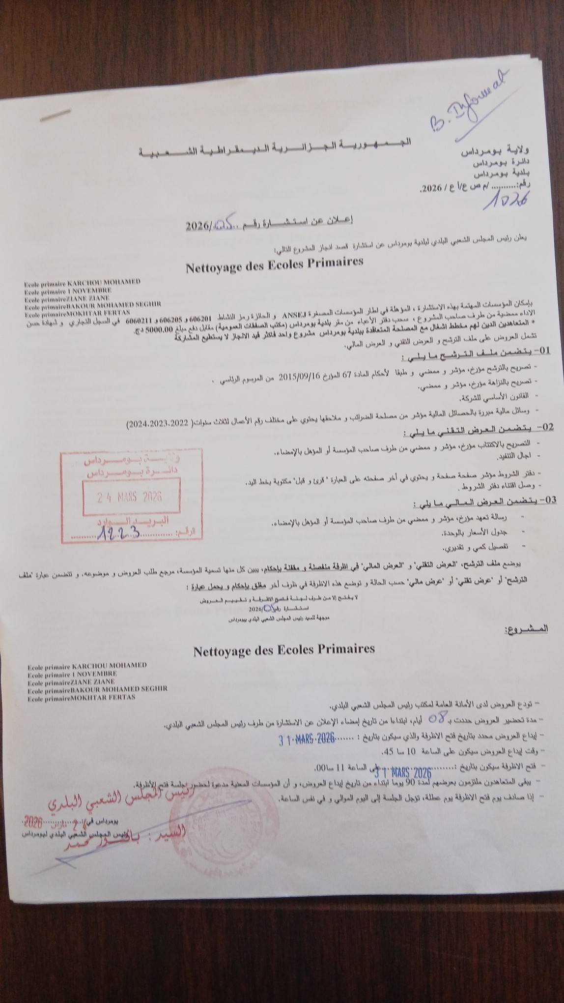 يعلن السيد رئيس المجلس الشعبي البلدي لبلدية بومرداس عن استشارة رقم 05 لانجاز المشروع التالي