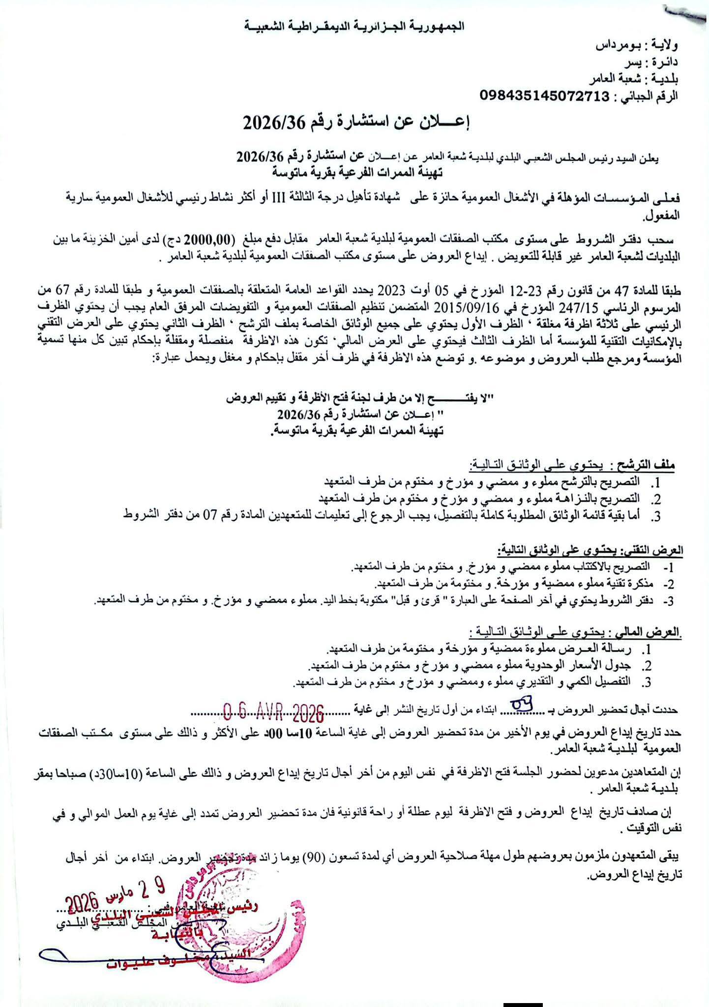 يعلن السيد رئيس المجلس الشعبي البلدي لبلدية شعبة العامر عن استشارة رقم 36 لانجاز المشروع التالي