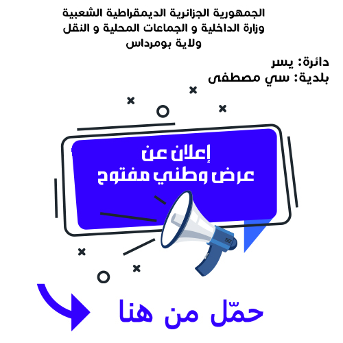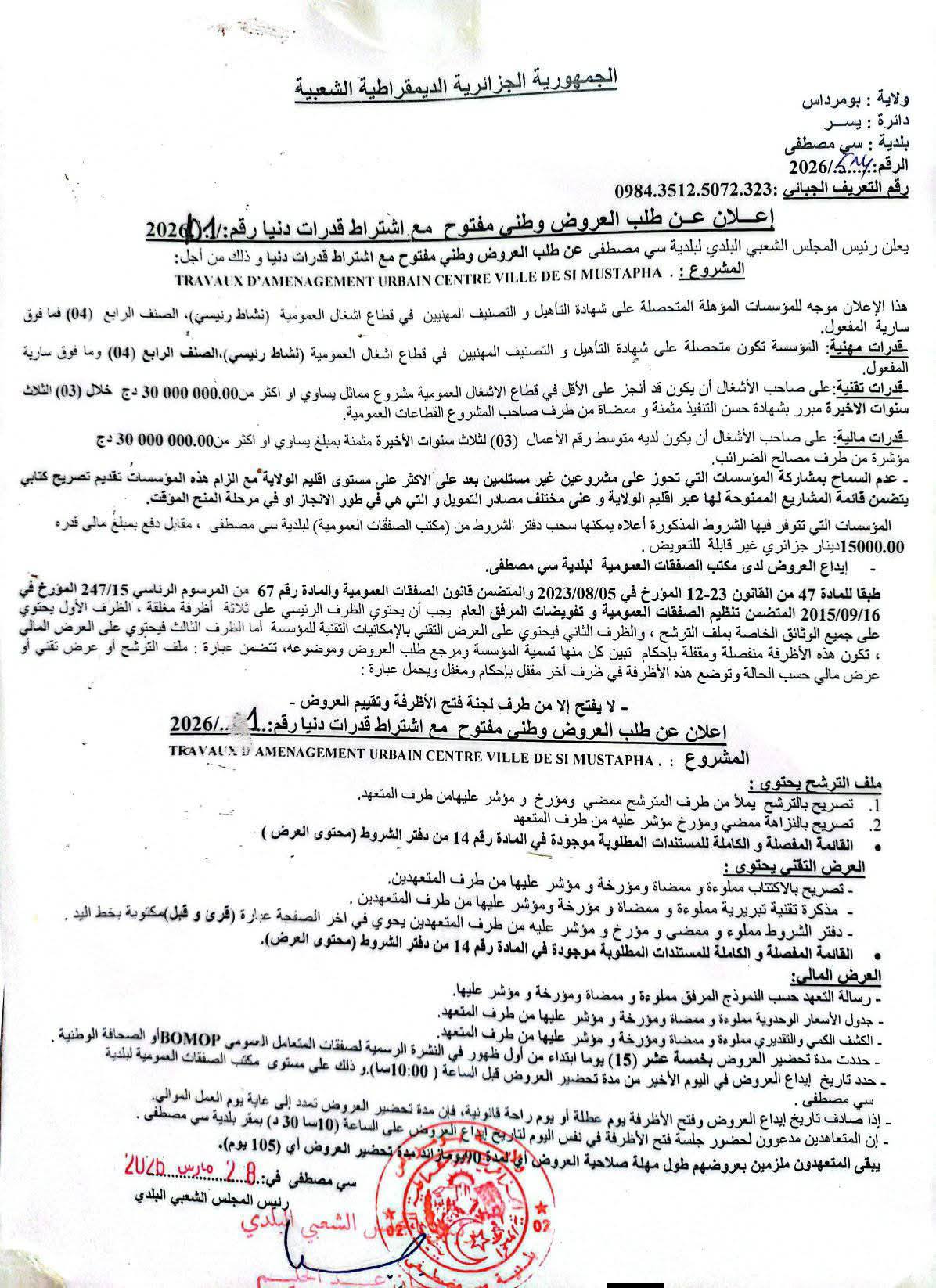 يعلن السيد رئيس المجلس الشعبي البلدي لبلدية سي مصطفى عن طلب العروض وطني مفتوح مع اشتراط قدرات دنيا رقم 01