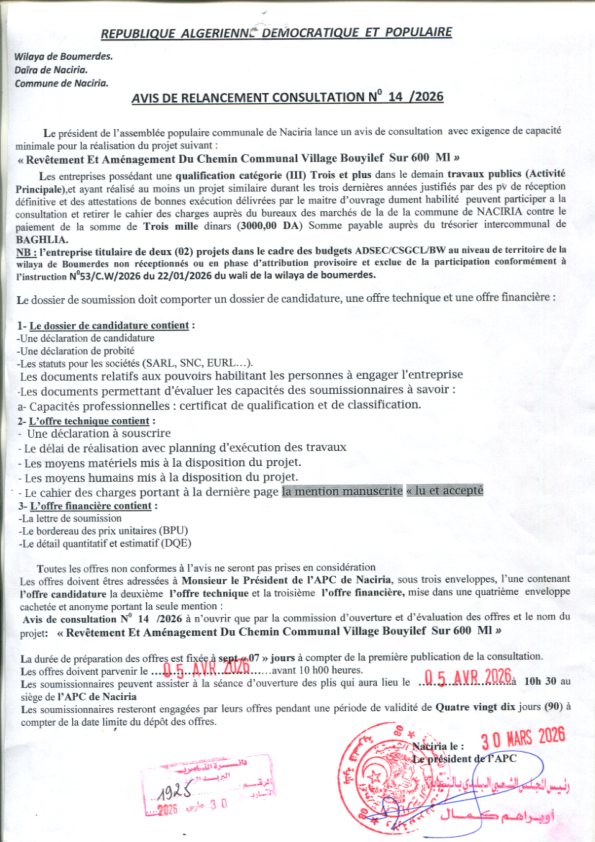 يعلن السيد رئيس المجلس الشعبي البلدي لبلدية الناصرية عن استشارة رقم 14